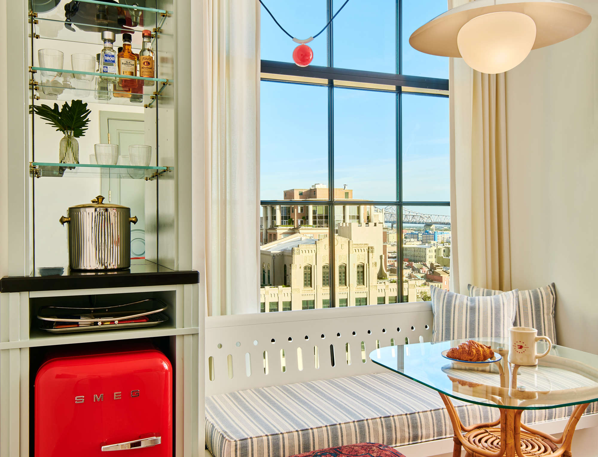 Enjoy top-notch views of New Orleans' exciting Warehouse District, comfort and amenities in our spectacular hotel chamber. Grab a snack from the SMEG fridge (stocked at street prices) and perch on the built-in window seat to enjoy sweeping views from your floor-to-ceiling windows over New Orleans. Or do your best Tom Cruise impression across the hardwood floors – just make sure to open the privacy door between your sleeping lounge and dressing area first! There’s also a complimentary yoga mat, walk-in shower and sit-down makeup vanity with an illuminated mirror. Because why not?