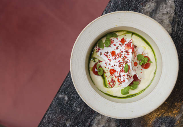 For your main course, choose from the Torched Scottish Mackerel with tangy buttermilk and green apple, or tender Lamb with peas, sheep’s curd, and charred onion.
