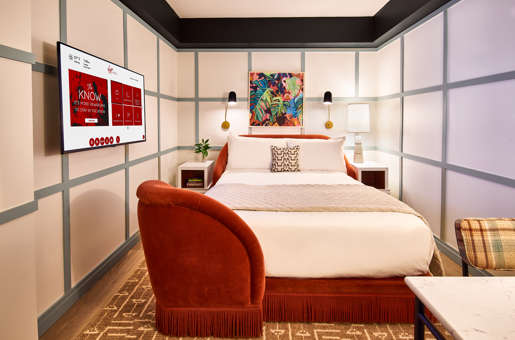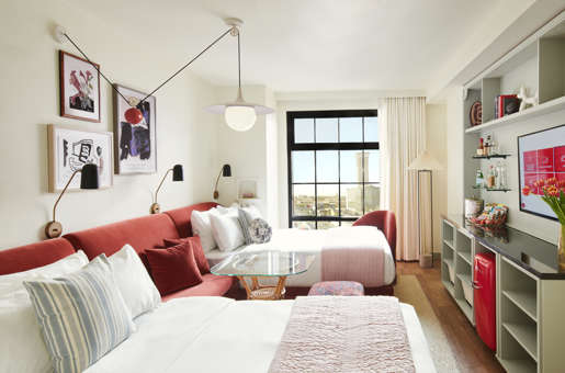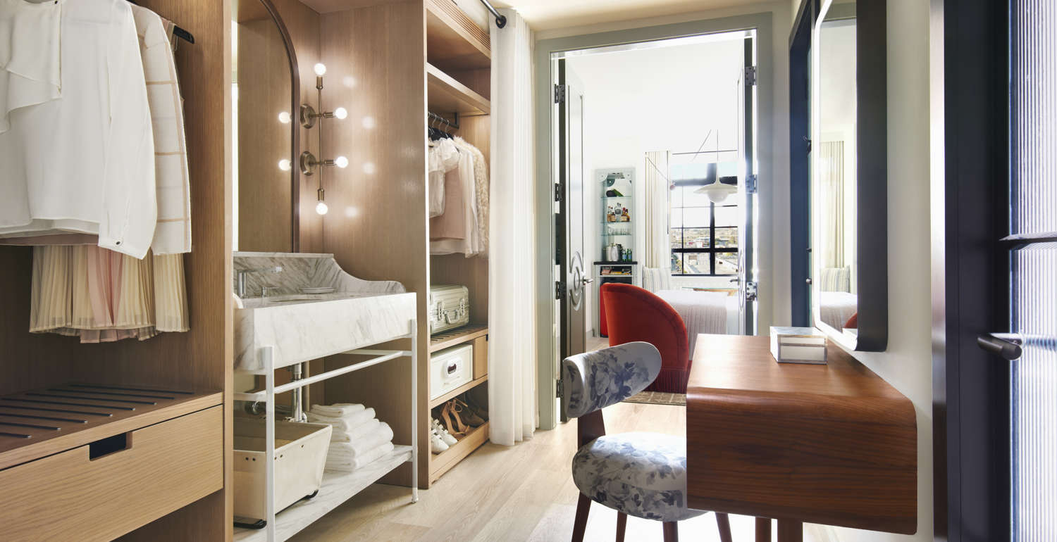 Enjoy top-notch views of New Orleans' exciting Warehouse District, comfort and amenities in our spectacular hotel chamber. Grab a snack from the SMEG fridge (stocked at street prices) and perch on the built-in window seat to enjoy sweeping views from your floor-to-ceiling windows over New Orleans. Or do your best Tom Cruise impression across the hardwood floors – just make sure to open the privacy door between your sleeping lounge and dressing area first! There’s also a complimentary yoga mat, walk-in shower and sit-down makeup vanity with an illuminated mirror. Because why not?